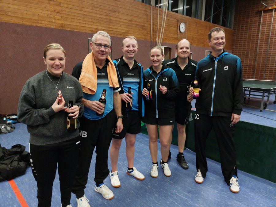 Für jeden Spieler der beiden Teams ergaben sich im Laufe des Abends zwei Einzel- sowie eine Doppelbegegnung, durch welche Punkte für das eigene Team erspielt werden konnten. Nach vielen interessanten Begegnungen erspielten sich schlussendlich mit 9:6 die "Nikoläuse" (Peter, Ebi, Markus, Simon, Michael und Bernd) den Sieg. Dennoch kam aber auch der Spaß bei den knapp unterlegenen "Weihnachtsmännern" (Julie, Fin, Tobi, Linda, Hajü und Christian) nicht zu kurz und auch sie konnten sich hinterher über etwas Schokolade zur Stärkung freuen. Somit war das 30. Weihnachtsturnier auch im Jahr 2023 ein gelungener Jahresabschluss für die Tischtennisabteilung.