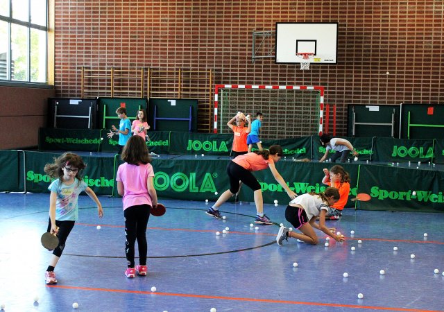 Am 23. August kamen um 9.00 Uhr 15 motivierte Kinder in die Theodor-Heuss-Halle, um bei dem Sommerferienprogramm „Tischtennis Schnuppertraining“ die Grundlagen des Tischtennis zu erlernen. Am Morgen haben wir bei verschiedenen Übungen die richtige Schlägerhaltung gelernt und uns mit Geschicklichkeitsübungen an den Tischtennisball und den Schläger gewöhnt. Bis zum Mittagessen haben wir dann die Grundschläge Vorhand- und Rückhandkonter, Rückhandunterschnitt und Topspin gelernt und verschiedene Aufschläge ausprobiert. Alle Kinder haben motiviert mitgemacht und ließen sich anschließend die belegten Brötchen schmecken. Gestärkt durch das Mittagessen ging das Schnuppertraining dann mit einem Abschlussturnier in zwei Gruppen zu Ende. Wir hoffen, es hat euch allen genau so viel Spaß gemacht wie uns. Falls ja, schaut doch einfach mal bei uns im Training vorbei!