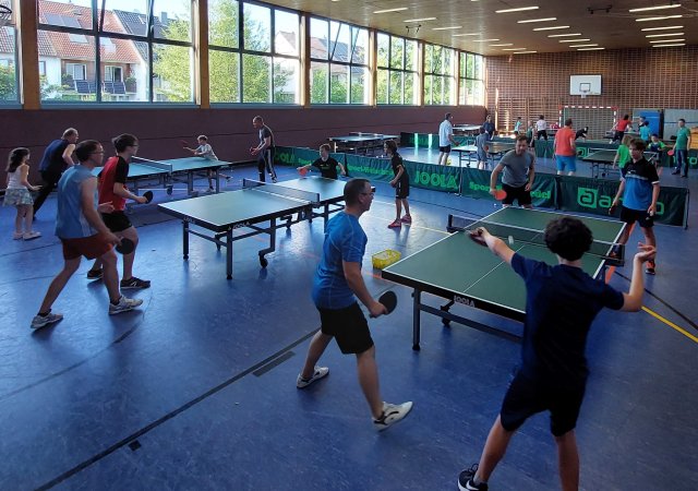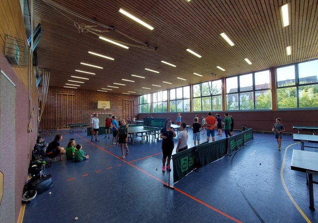 Am Donnerstagabend, den 06.07.2023 war die Halle nicht nur durch eine Vielzahl von Kindern gut gefüllt, sondern auch viele Mamas, Papas und Geschwister hatten sich um 18 Uhr zum Tischtennis spielen versammelt. Mit der überwältigenden Anzahl von 14 Teams begann nach ein paar Minuten des Plattenaufbaus und anschließendem Einspielens das 1. Rutesheimer Tischtennis Eltern-Kind-Turnier. Gespielt wurden Doppelpartien in vier gelosten und jeweils 3-4 Teams starken Gruppen.