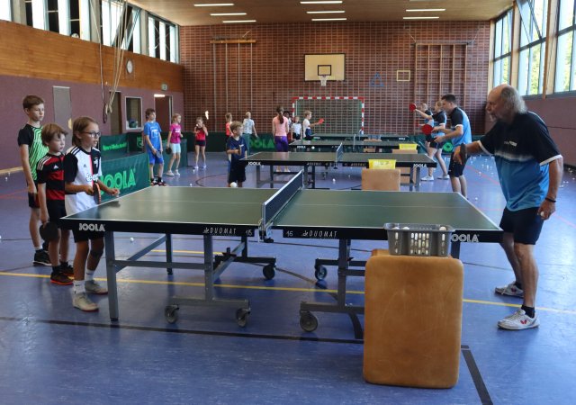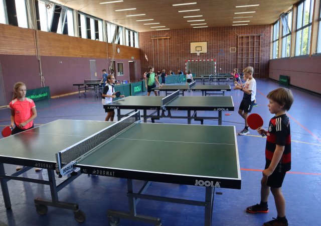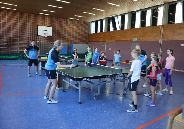 Am 3. August kamen um 9.00 Uhr 14 motivierte Kinder in die Theodor-Heuss-Halle, um bei dem Sommerferienprogramm „Tischtennis Schnuppertraining“ die Grundlagen des Tischtennis zu erlernen. Am Morgen haben wir bei verschiedenen Übungen die richtige Schlägerhaltung gelernt sowie uns mit Geschicklichkeitsübungen an den Tischtennisball und den Schläger gewöhnt. Bis zum Mittagessen haben wir dann die Grundschläge Vorhand- und Rückhandkonter, Rückhandunterschnitt und Topspin gelernt und verschiedene Aufschläge ausprobiert. Alle Kinder haben motiviert mitgemacht und ließen sich anschließend die (Butter-)Brezeln sowie weitere Snacks schmecken. Gestärkt durch das Mittagessen ging das Schnuppertraining dann mit einem Abschlussturnier in zwei Gruppen zu Ende. Wir hoffen, es hat euch allen genau so viel Spaß gemacht wie uns.