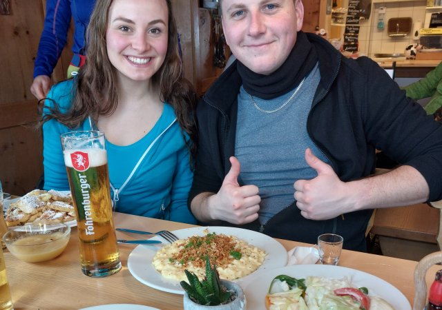 Am Samstagmorgen waren alle motiviert sich früh Richtung Gondel aufzumachen. Etwas ausgebremst wurde die Truppe aber dadurch, dass über die ganze Nacht bis in das Tal herunter eine ordentliche Menge Neuschnee vom Himmel gekommen war. Somit hieß es erst einmal die auf rund 1100m vor der Hütte geparkten Autos vom Schnee zu befreien, um dann mit den fahrtüchtigen Autos loszufahren. In der Folge erlebte die Truppe sowohl am Samstag als auch am Sonntag schöne Skitage, auch wenn das Wetter sich nicht immer von der besten Seite zeigte. Der frische Schnee führte aber zu guten und gleichzeitig nicht allzu vollen Pisten. Gut verköstigt wurde man tagsüber auf der in 2300m Höhe gelegenen Wormser Hütte und am Samstagabend von Simons/Christians Bolognese.