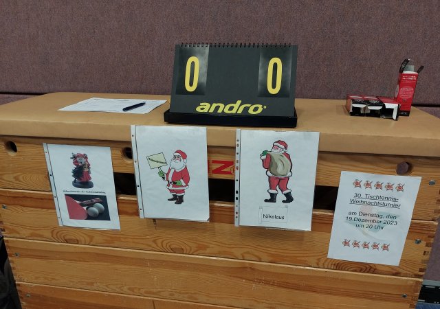 Zum 30. Jubiläum des alljährlichen Weihnachtsturnier am Dienstagabend des 19.12.2023 konnten 12 Spieler in der Theodor-Heuss-Halle begrüßt werden. Zuvor hatten bereits einige mitgeholfen alle Platten sowie Netze zu reparieren und zu putzen. Nachdem Organisator Dieter Sauter die anwesenden Spieler gerecht auf die zwei Mannschaften "Nikoläuse" und "Weihnachtsmänner" aufgeteilt hatte, konnte direkt das frisch gerichtete Tischtennismaterial getestet werden.