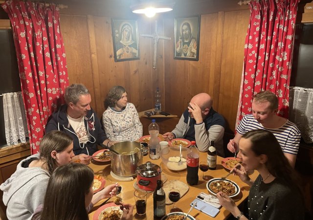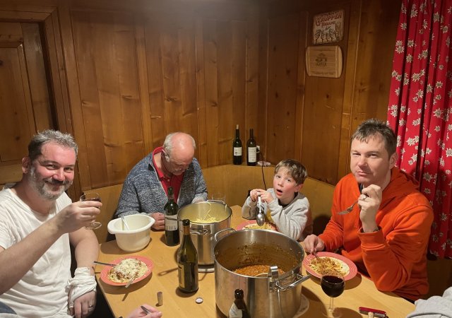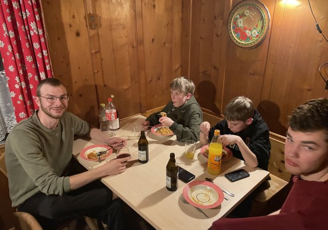 Am Samstagmorgen waren alle motiviert sich früh Richtung Gondel aufzumachen. Etwas ausgebremst wurde die Truppe aber dadurch, dass über die ganze Nacht bis in das Tal herunter eine ordentliche Menge Neuschnee vom Himmel gekommen war. Somit hieß es erst einmal die auf rund 1100m vor der Hütte geparkten Autos vom Schnee zu befreien, um dann mit den fahrtüchtigen Autos loszufahren. In der Folge erlebte die Truppe sowohl am Samstag als auch am Sonntag schöne Skitage, auch wenn das Wetter sich nicht immer von der besten Seite zeigte. Der frische Schnee führte aber zu guten und gleichzeitig nicht allzu vollen Pisten. Gut verköstigt wurde man tagsüber auf der in 2300m Höhe gelegenen Wormser Hütte und am Samstagabend von Simons/Christians Bolognese.