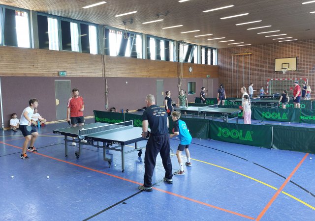 Das mit neun Teams erneut große Teilnehmerfeld bauten zuerst einmal gemeinsam die Tischtennisplatten auf um sich im Anschluss ein paar Minuten zusammen einzuspielen. In diesem Jahr wurde nicht in Gruppen gespielt, sondern es spielte jedes Doppelpaar (Kind mit Papa/Mama/Schwester/Tante) gegen alle anderen Teams.