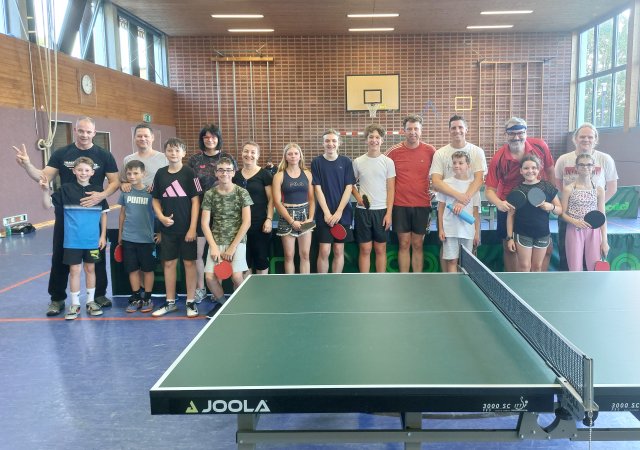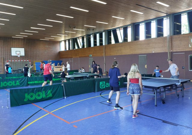 Das mit neun Teams erneut große Teilnehmerfeld bauten zuerst einmal gemeinsam die Tischtennisplatten auf um sich im Anschluss ein paar Minuten zusammen einzuspielen. In diesem Jahr wurde nicht in Gruppen gespielt, sondern es spielte jedes Doppelpaar (Kind mit Papa/Mama/Schwester/Tante) gegen alle anderen Teams.