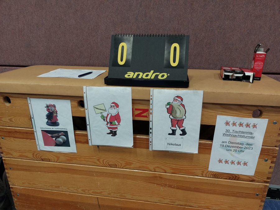 Zum 30. Jubiläum des alljährlichen Weihnachtsturnier am Dienstagabend des 19.12.2023 konnten 12 Spieler in der Theodor-Heuss-Halle begrüßt werden. Zuvor hatten bereits einige mitgeholfen alle Platten sowie Netze zu reparieren und zu putzen. Nachdem Organisator Dieter Sauter die anwesenden Spieler gerecht auf die zwei Mannschaften "Nikoläuse" und "Weihnachtsmänner" aufgeteilt hatte, konnte direkt das frisch gerichtete Tischtennismaterial getestet werden.
