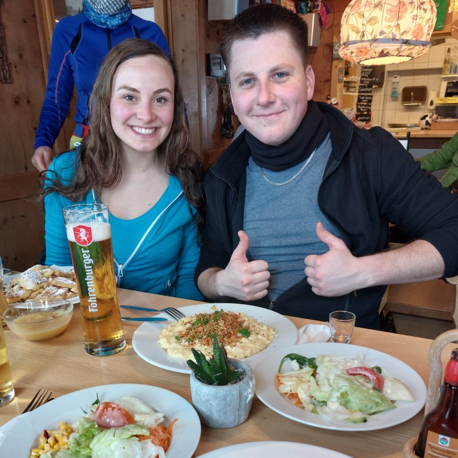 Am Samstagmorgen waren alle motiviert sich früh Richtung Gondel aufzumachen. Etwas ausgebremst wurde die Truppe aber dadurch, dass über die ganze Nacht bis in das Tal herunter eine ordentliche Menge Neuschnee vom Himmel gekommen war. Somit hieß es erst einmal die auf rund 1100m vor der Hütte geparkten Autos vom Schnee zu befreien, um dann mit den fahrtüchtigen Autos loszufahren. In der Folge erlebte die Truppe sowohl am Samstag als auch am Sonntag schöne Skitage, auch wenn das Wetter sich nicht immer von der besten Seite zeigte. Der frische Schnee führte aber zu guten und gleichzeitig nicht allzu vollen Pisten. Gut verköstigt wurde man tagsüber auf der in 2300m Höhe gelegenen Wormser Hütte und am Samstagabend von Simons/Christians Bolognese.